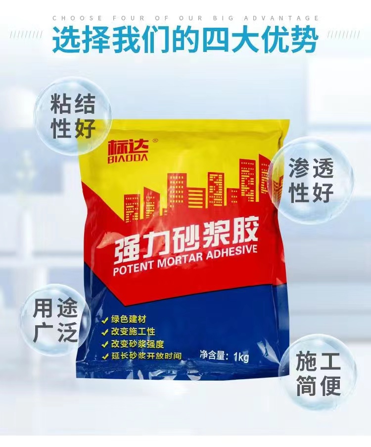 產(chǎn)品主要成分是膠精、減水劑等添加劑。添加到水泥砂漿中使水泥砂漿水化反應(yīng)更加充分,增加粘結(jié)強(qiáng)度,不破壞水度泥強(qiáng)度的提高水泥砂漿的保水性,施工性,黏性柔韌性,降低瓷磚空鼓脫落隱患。